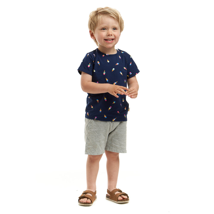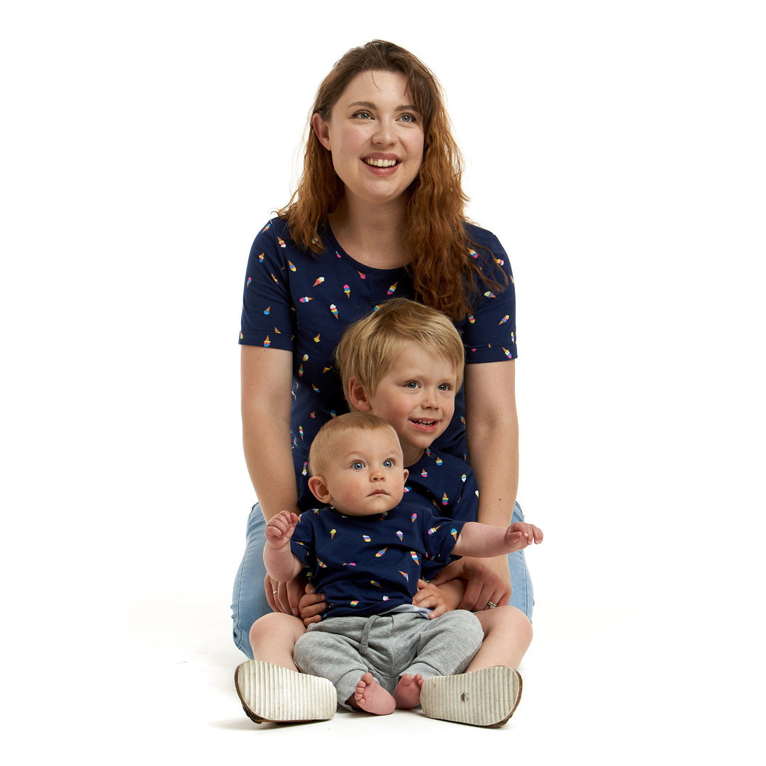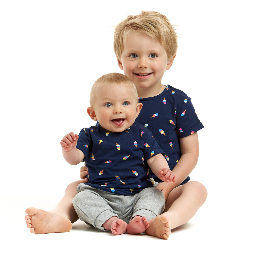 Our gorgeous mini-me Izzy features stylish rolled sleeves and a popper on the neckline for quick and fuss-free changing for those wriggly babies. In a sweet Ice Cream print design, this tee is made from 100% super soft cotton for delicate skin.